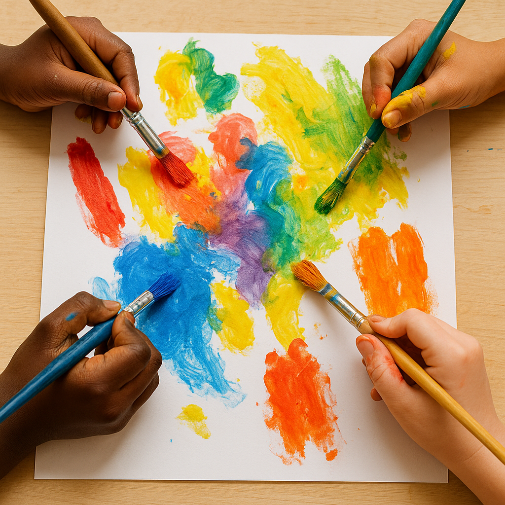 Older elementary children will be learning and focusing on a variety of brushes and tools, problem-solving when something doesn’t go as planned mixing colors.