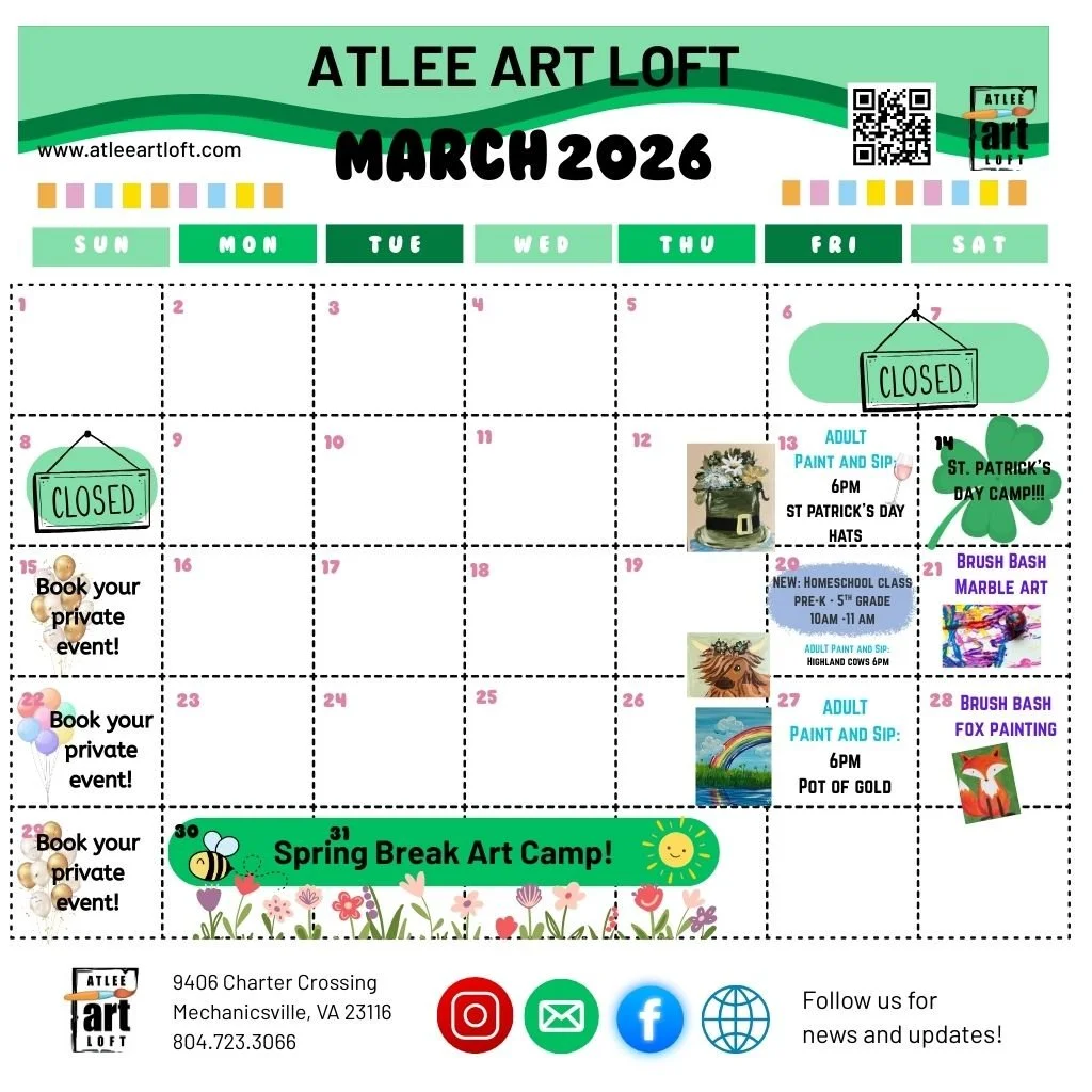 From seasonal workshops and engaging art camps to family paint nights and vibrant community events, there’s always something creative and inspiring happening at The Atlee Art Loft. Browse our carefully curated calendar to find the perfect class or event designed to spark your imagination and nurture your inner artist.